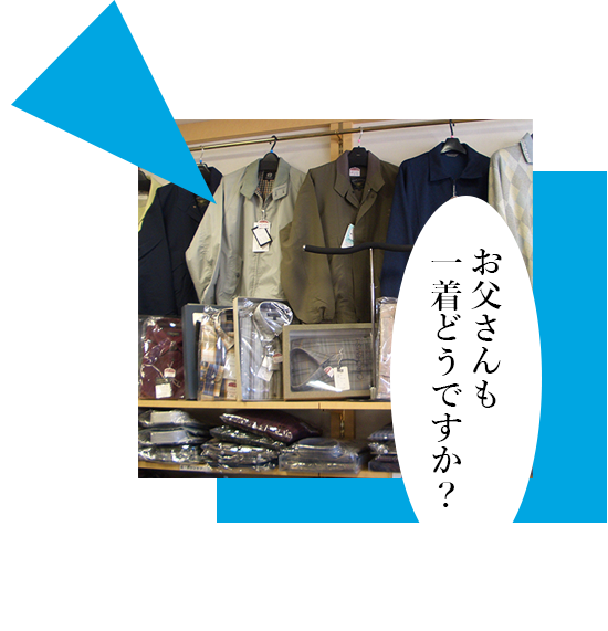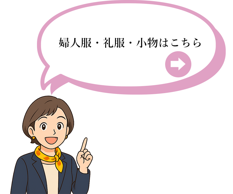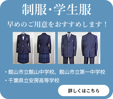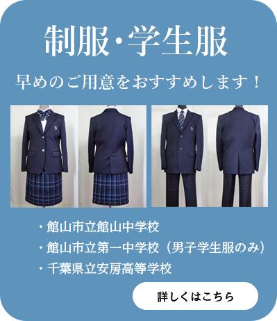 普段使いの実用的な洋品から、ちょっとしたお出かけにぴったりのおしゃれ着、冠婚葬祭や各種式典にふさわしい礼服やフォーマルドレス、入院や介護に適した着やすい衣服まで幅広くご用意しております。また、館山市立館山中学校・館山市立第一中学校・千葉県立安房高等学校の制服も取り扱っておりますのでお任せください。