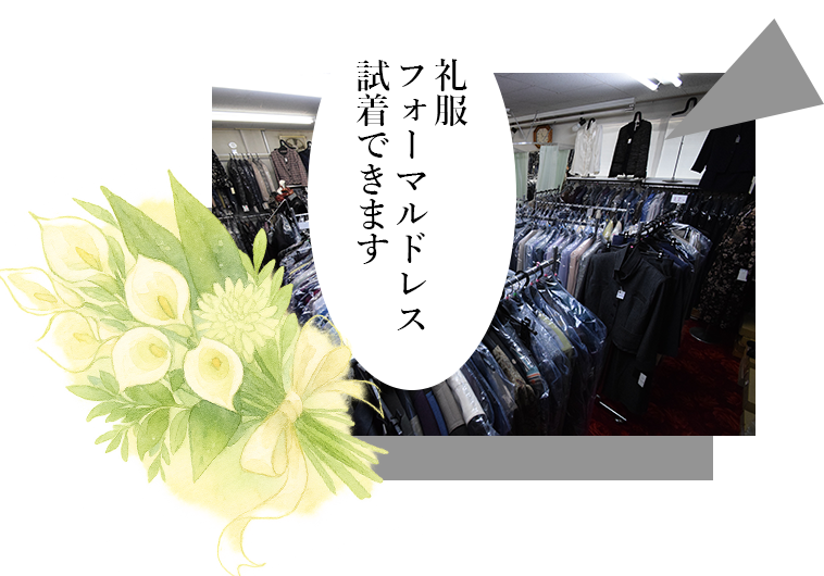 礼服やフォーマルドレスを実際に試着していただけます。9号から17号まで取り揃え、あなたをより一層引き立てる特別な装いを、安心してお選びください。